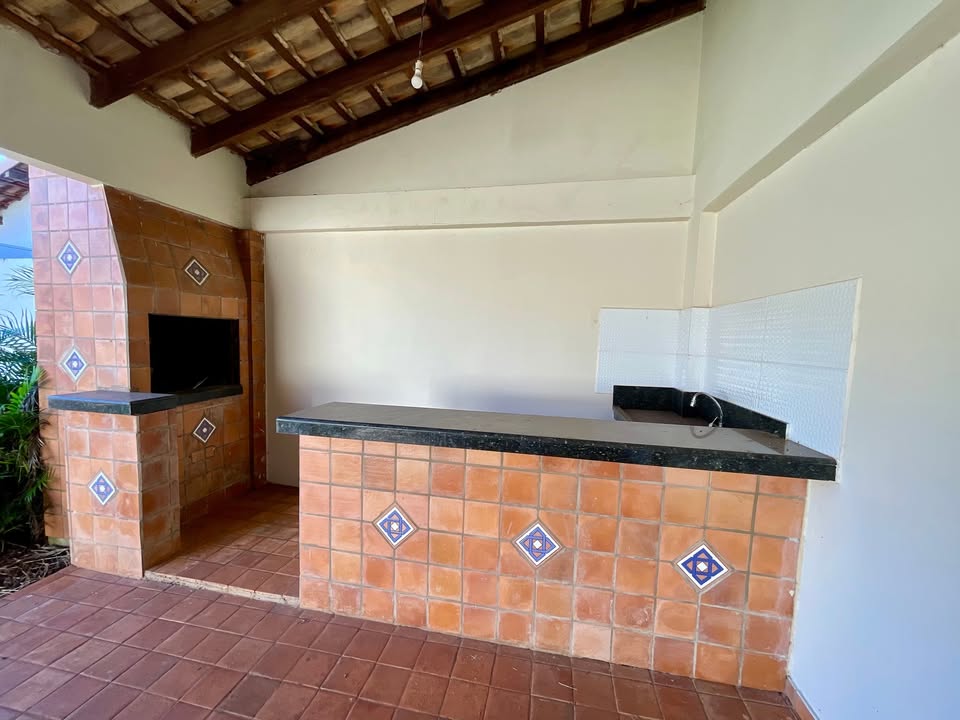 Area gourmet com churrasqueira separada da casa e um salão anexo.